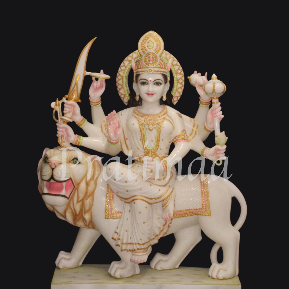Pure white marble Durga Maa idol with rich golden work and serene detailing. Enhances spiritual atmosphere and invites divine blessings into your home.